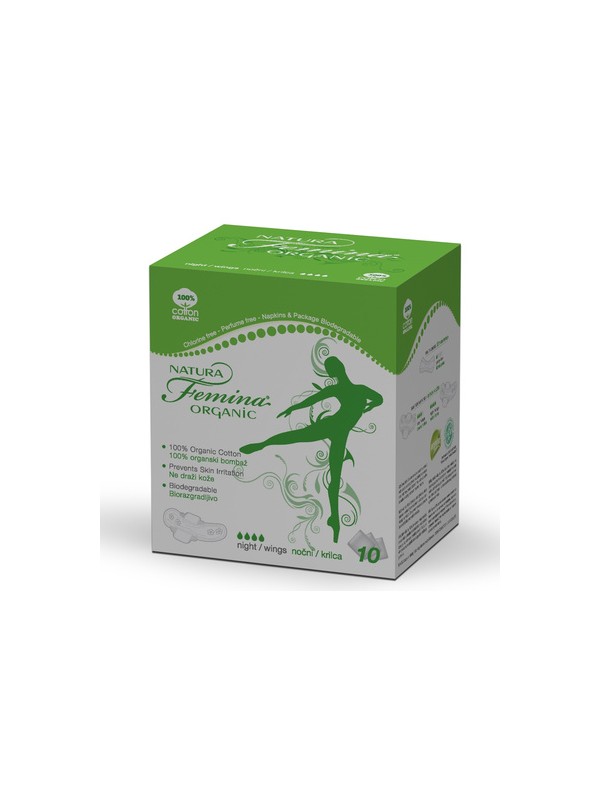 Naravna sestava vložka iz 100% čistega organskega bombaža nudi nežnost, mehkobo, zračnost, vpojnost in je kompatibilna s pH kože zato je prijazna koži. Izdelki so dermatološko testirani, omogočajo dihanje kože, ustrezajo fiziološki vrednosti pH, preprečujejo iritacije in dokazano omilijo simptome vnetij, alergij in neprijetne srbečice. Izdelki ne vsebujejo klora, parfumov in super vpojnih kemičnih praškov. Bombažni vložki so posamično pakirani v biorazgradljive in kompostirne folije in zato zelo prijazne okolju. Linija Natura Femina Organic je izdelana za ženske, ki imajo visoka merila pri izbiri zaveznika zase in okolje. Vložki so posamično pakirani, 10 vložkov v zloženki.